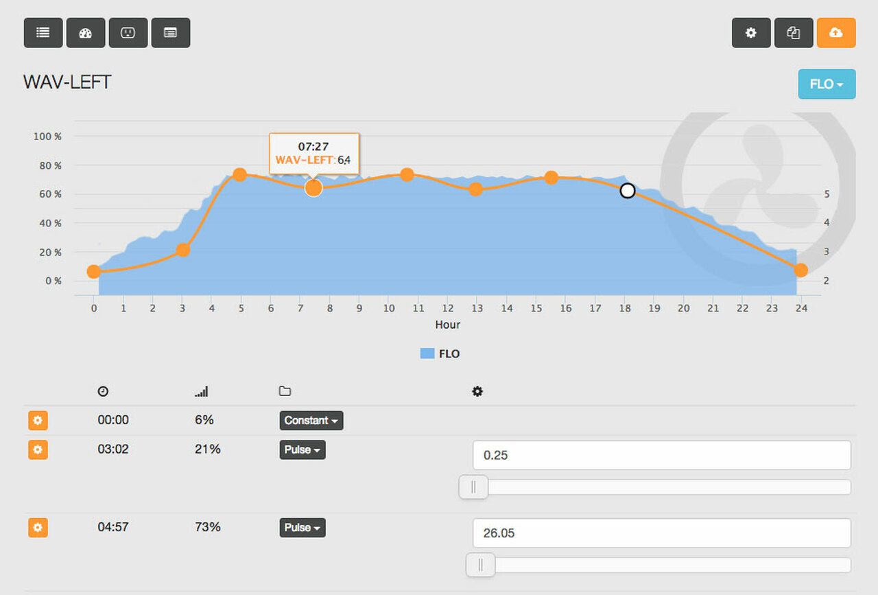 We know that everyone likes their flow a little bit different. So Apex Fusion controls the WAV with a multitude of patterned flow and random settings. You can even set one or more pumps to mirror or be the inverse of another. The easy to use Apex Fusion scheduling graph makes it a snap to set up huge waves in the morning, stir up detritus in the afternoon, and slow the flow at night. The flow in your aquarium can be as unique as your favorite coral!